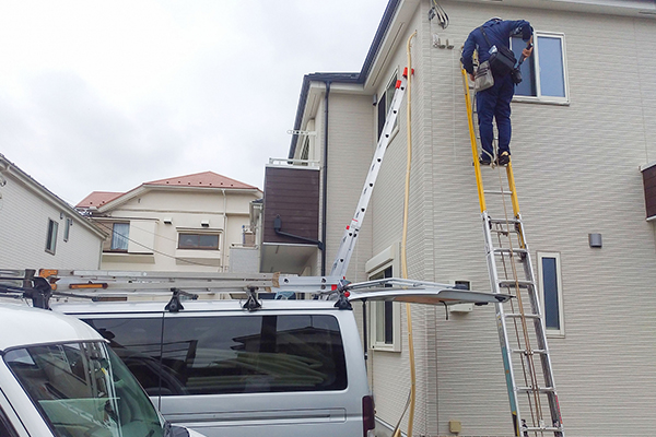 そばにある電柱から宅内へ光回線を引き込む開通工事を行っております。